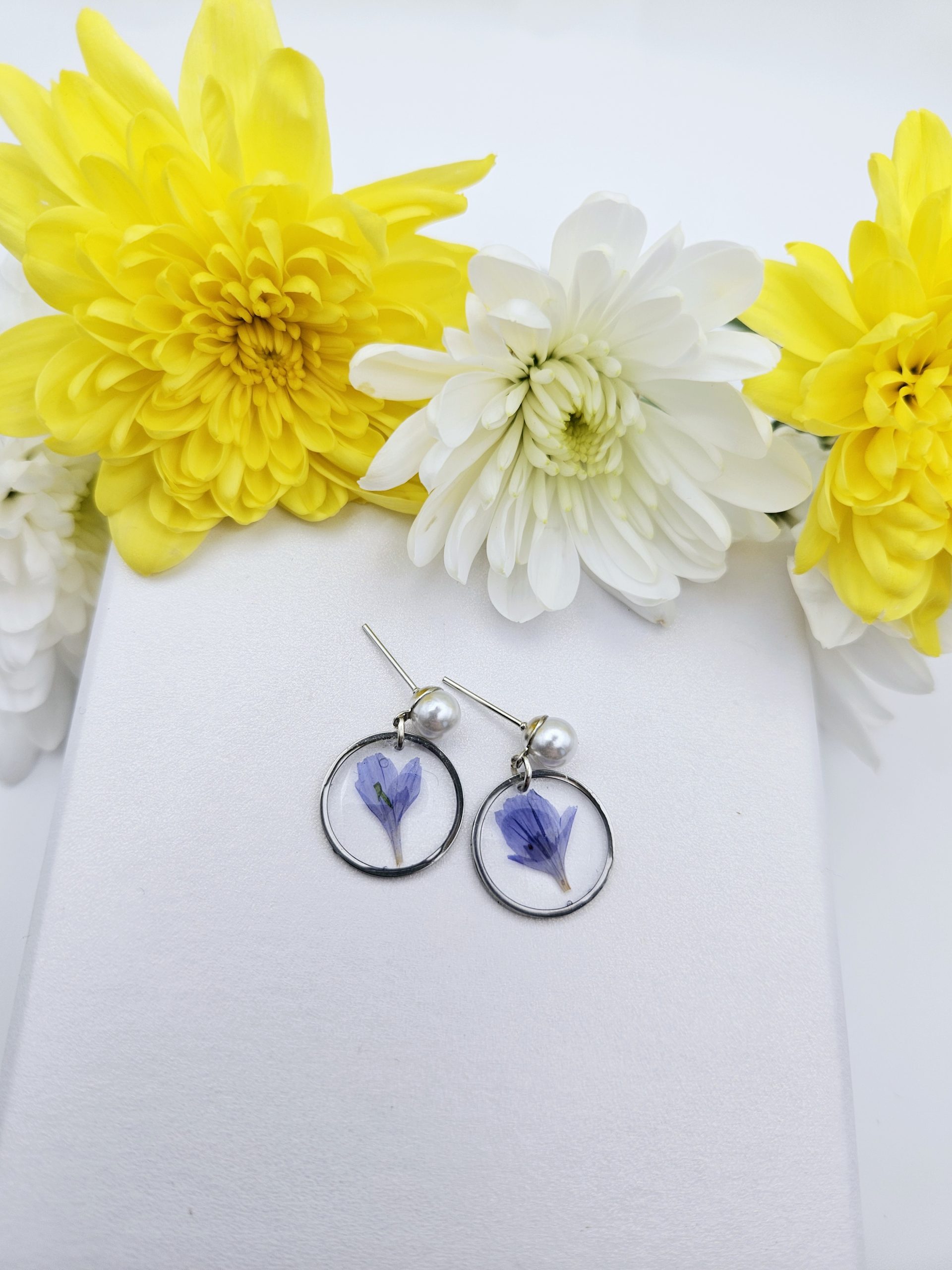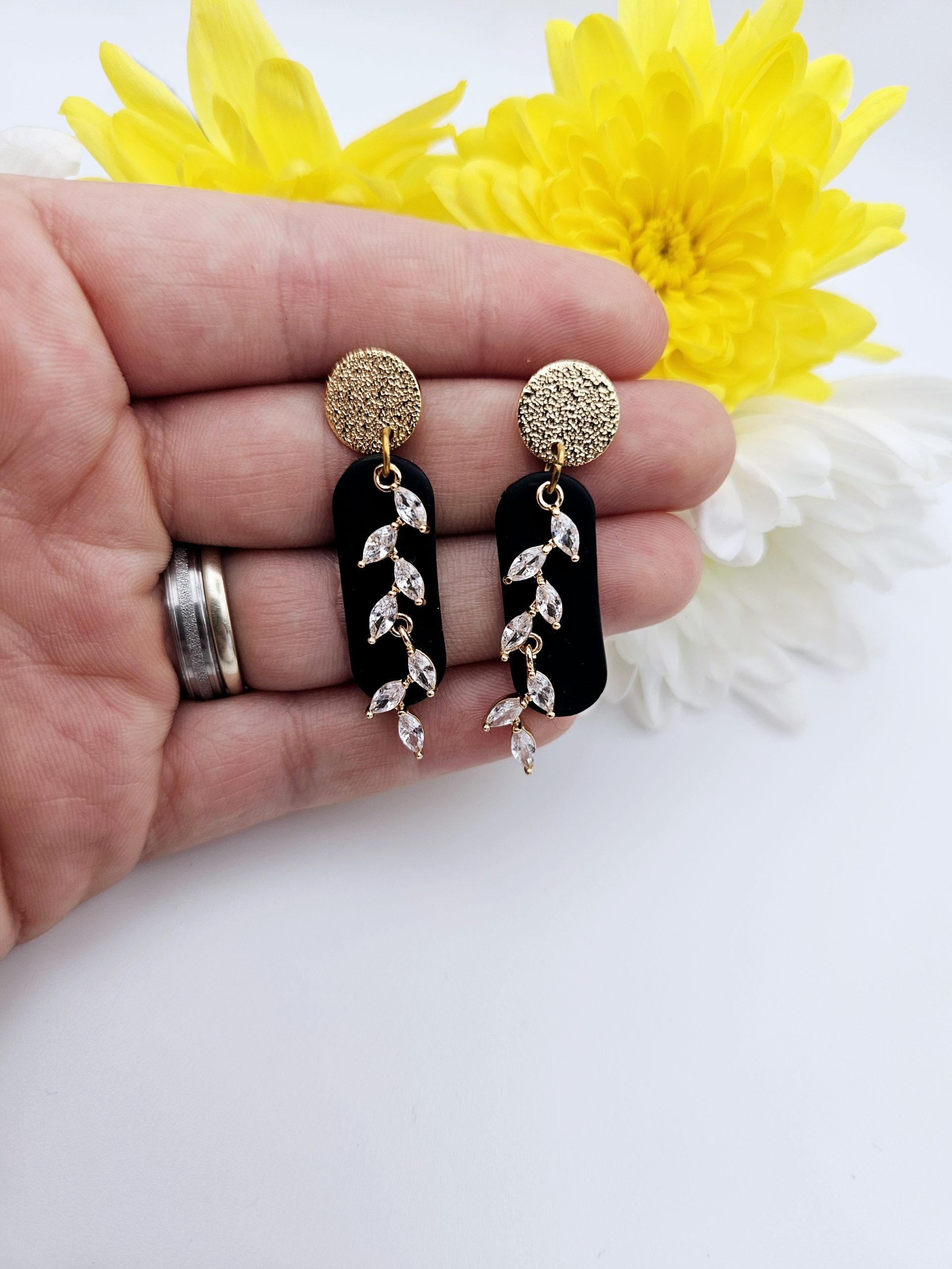 Sleek and modern with a subtle botanical touch, these handcrafted hoop drop earrings feature a textured black floral disc suspended within a gold-tone circle. The contrast between the matte black flower detail and the warm gold hoop creates a striking yet versatile design that moves beautifully as you wear it.