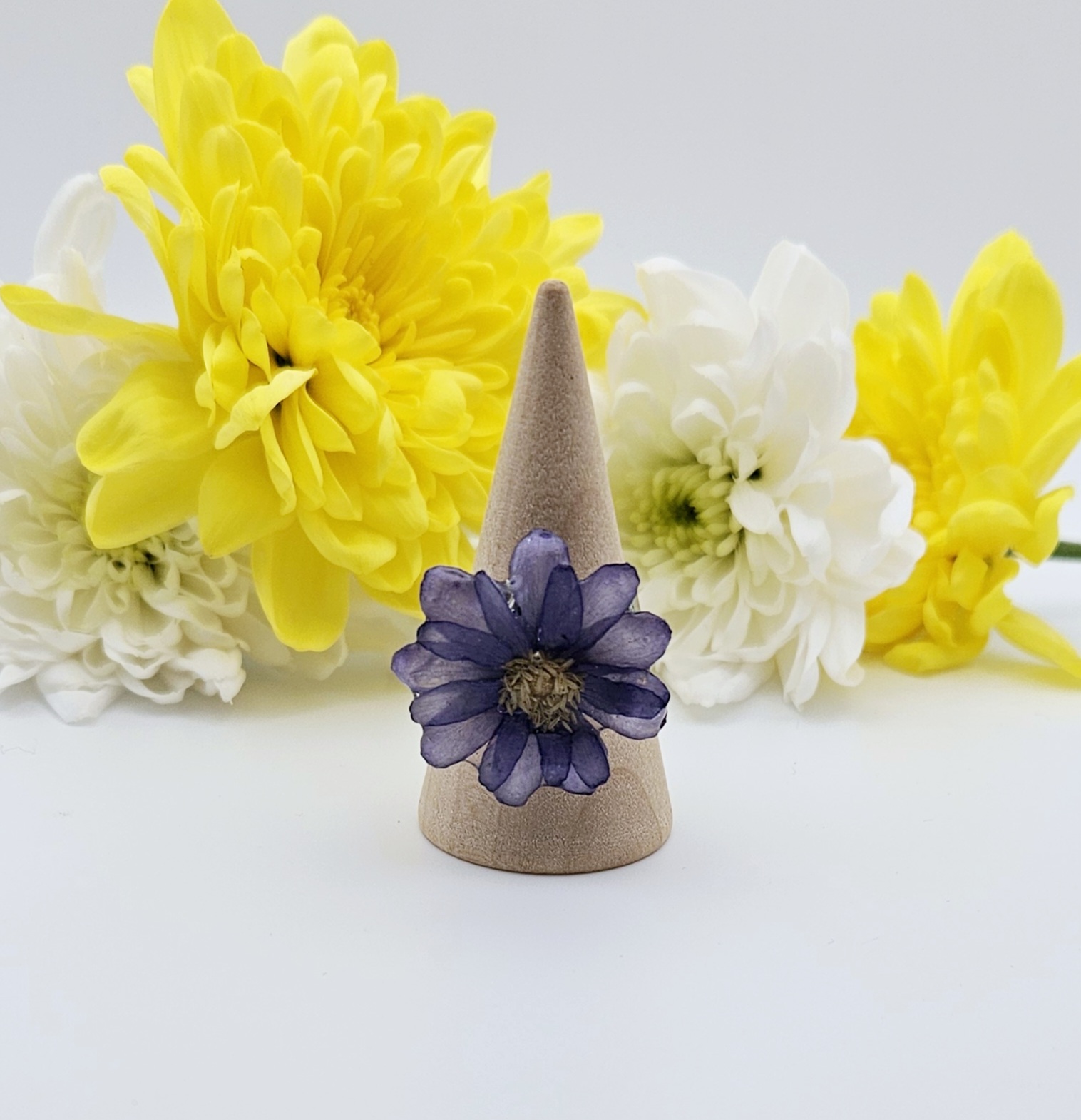 Handcrafted statement ring featuring a real pressed white daisy preserved in clear resin. Bright, natural, and beautifully one of a kind.