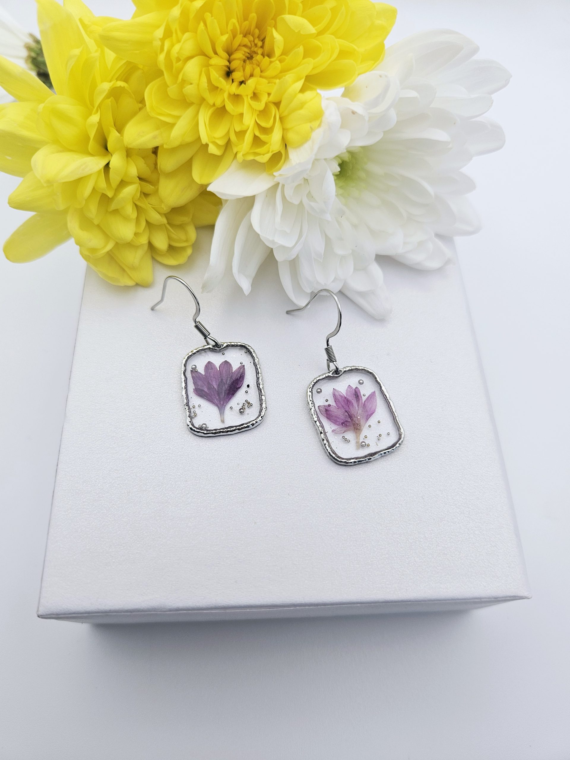 Bright, delicate, and beautifully timeless, these handcrafted stainless steel drop earrings feature real pressed daisy blooms preserved in clear resin and framed in elegant gold-tone square settings. Flecks of gold leaf add a soft shimmer, enhancing the natural beauty of the white petals and sunny centers.
