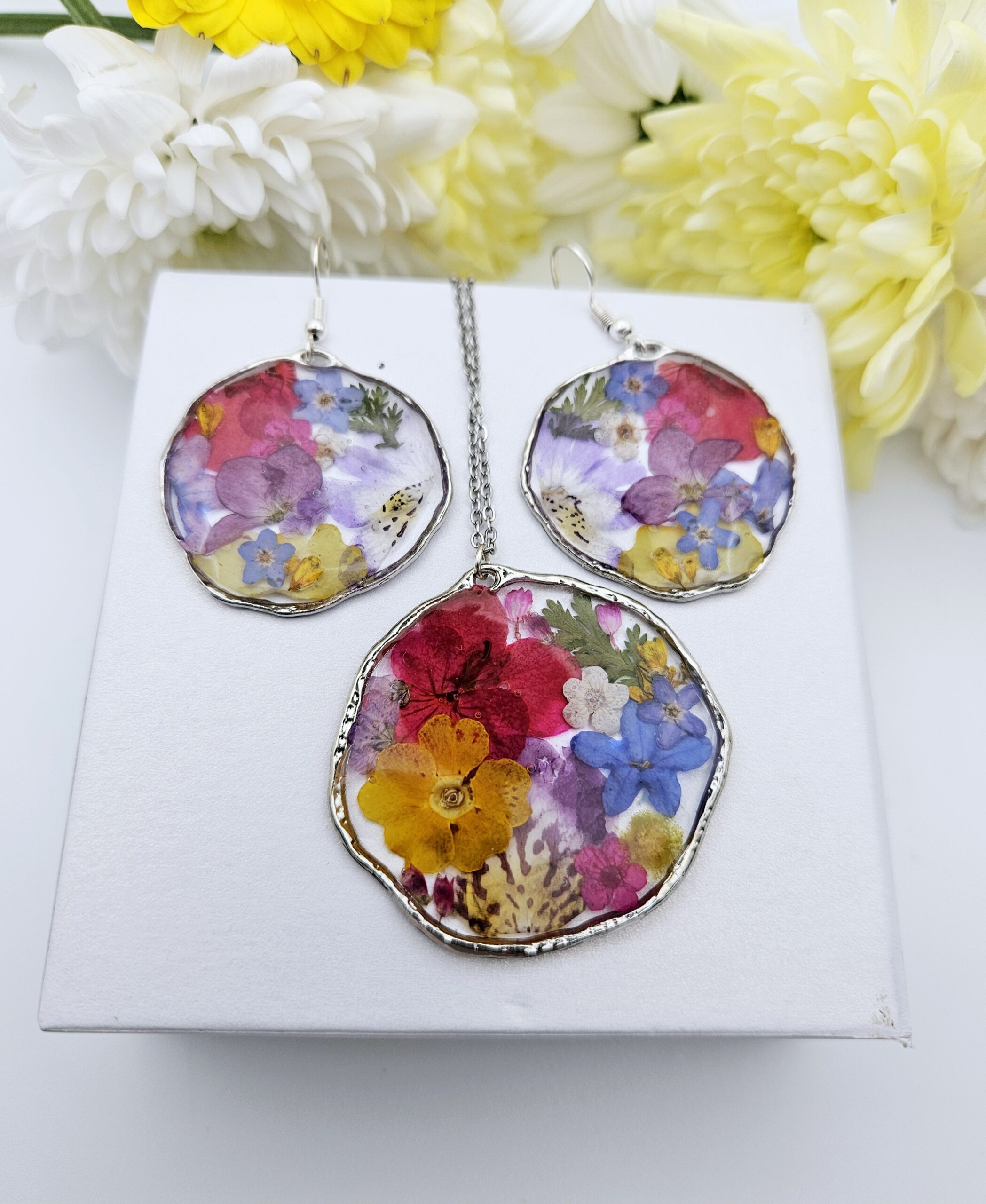 Handmade jewellery set featuring real black, white, and yellow pressed flowers preserved in resin, framed with organic silver-tone edging. A timeless botanical design for any occasion.