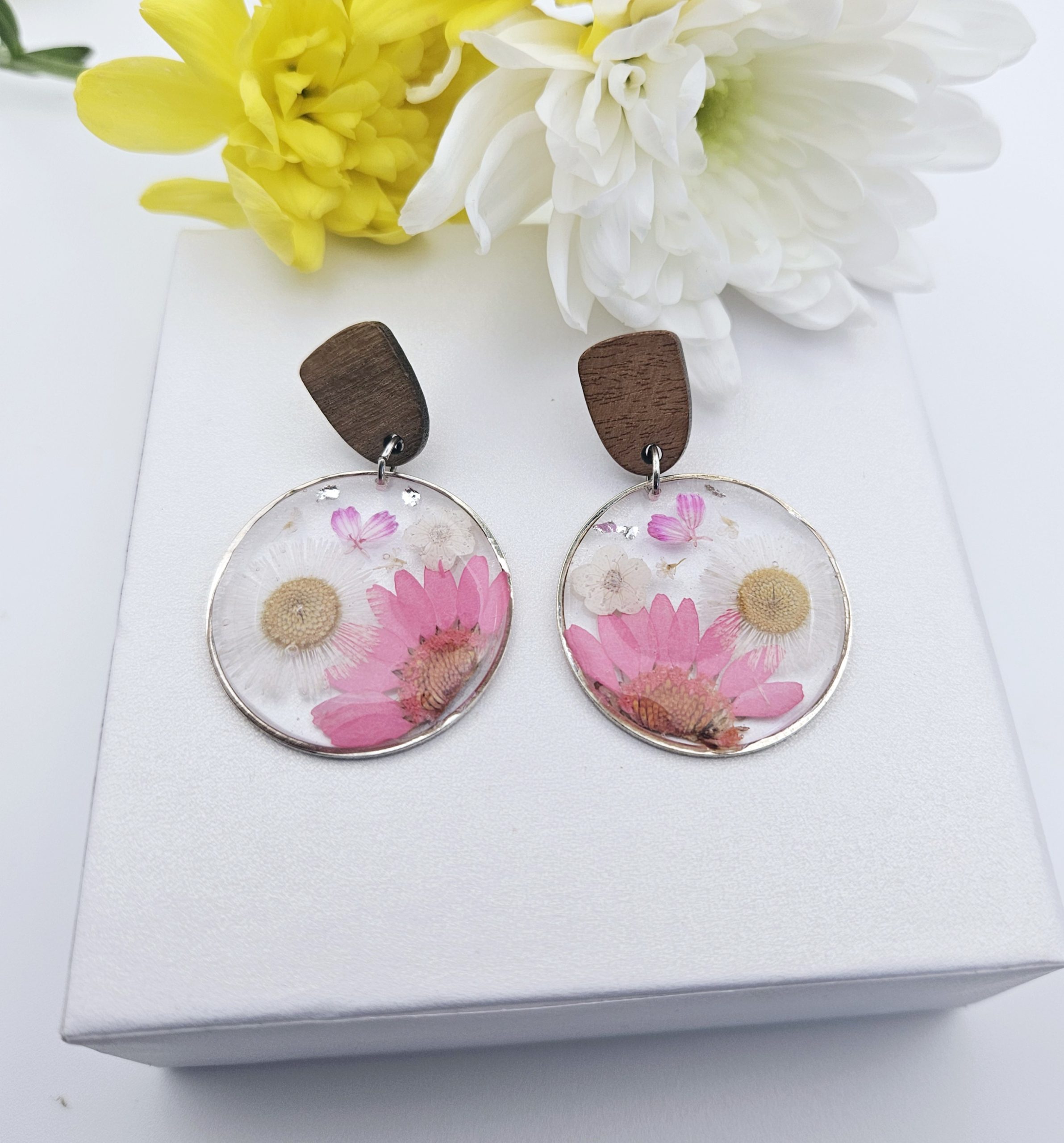 Handcrafted floral resin huggie earrings featuring real dried roses and gold leaf accents. Lightweight, elegant, and one of a kind.