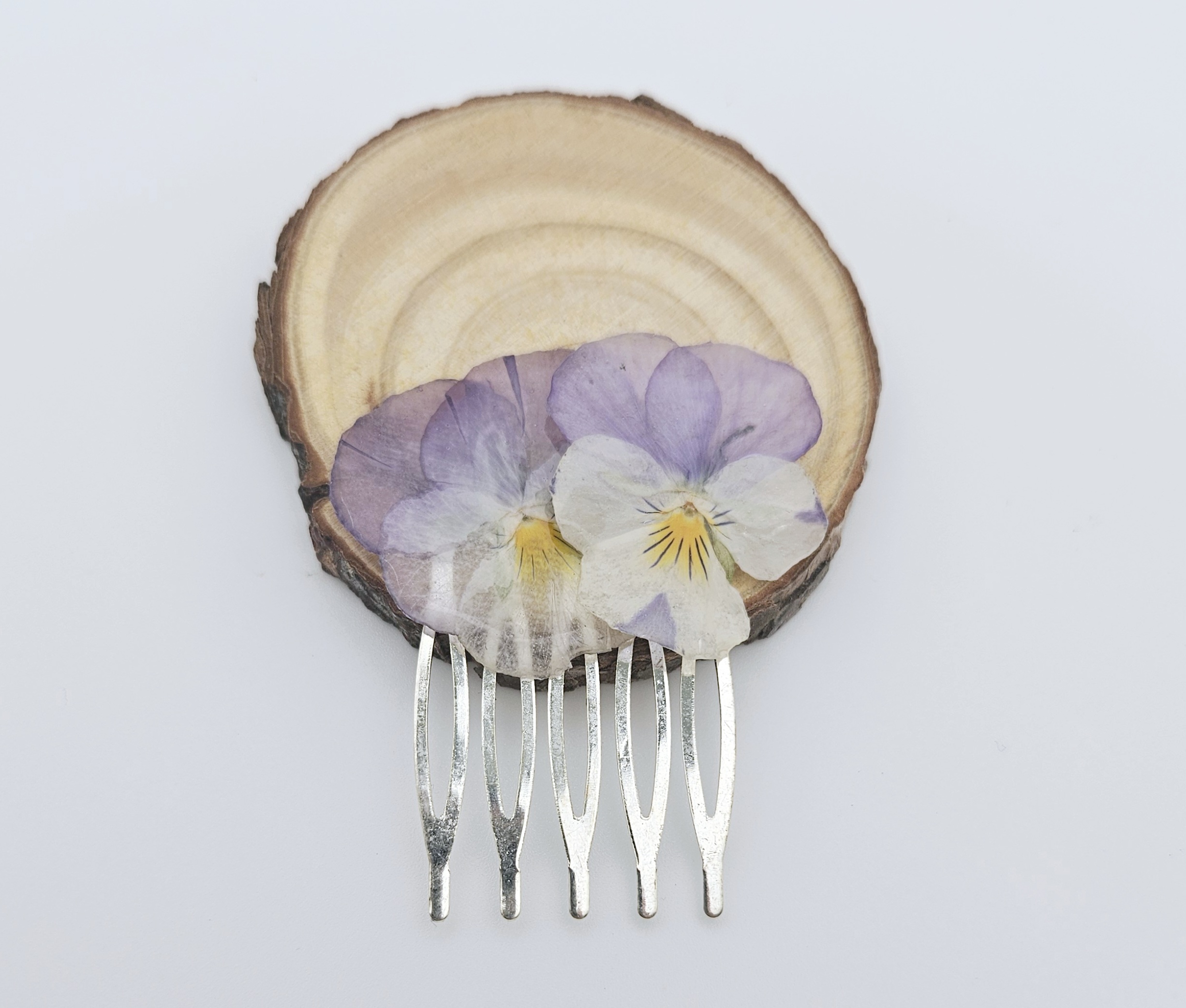 Handmade viola flower hair comb featuring real pressed blooms preserved in resin—perfect for adding a natural, romantic touch to any hairstyle. (Colours may slightly vary).