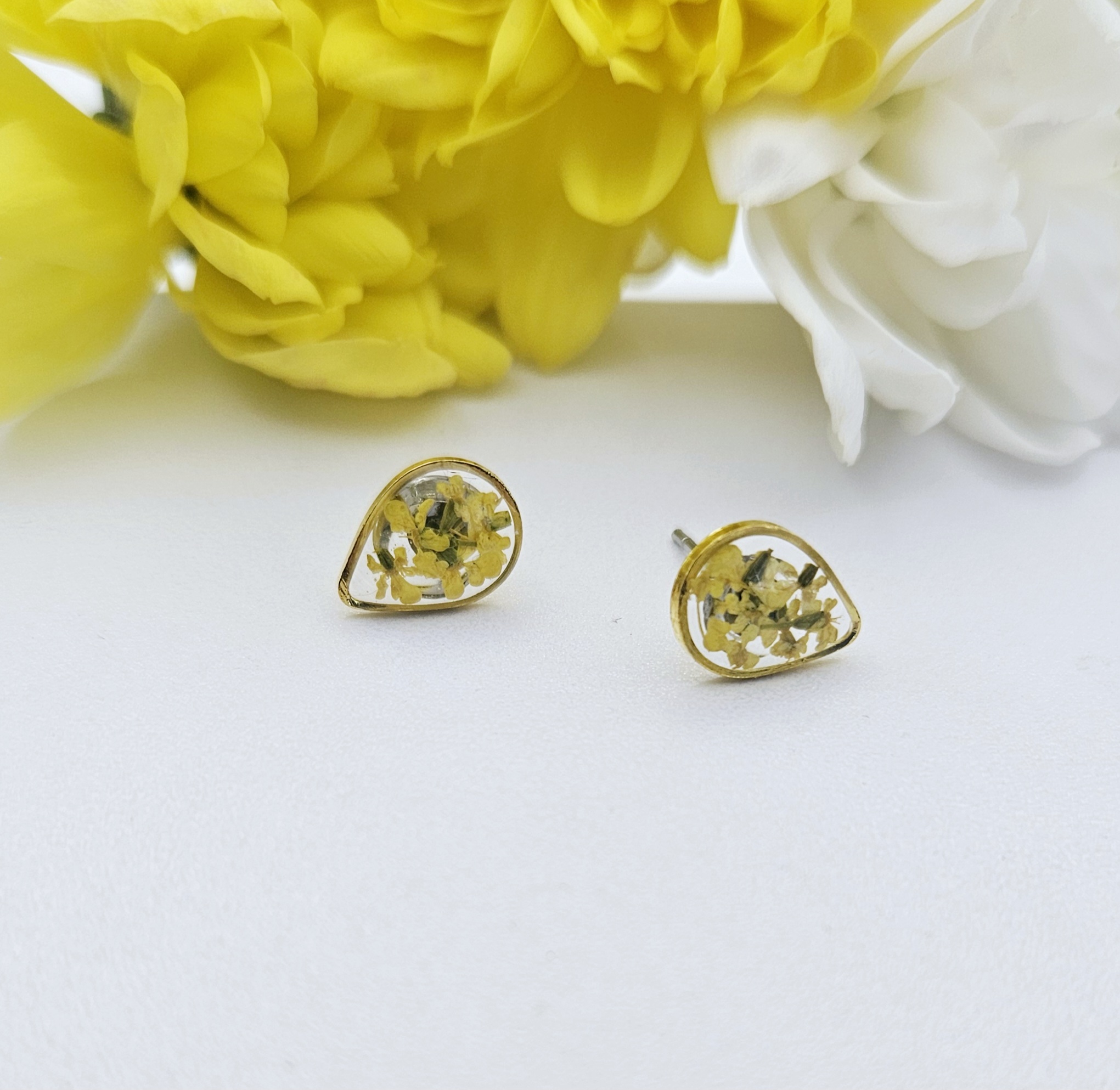 Petite teardrop stud earrings with real pressed yellow flowers set in clear resin and gold-tone frames, offering a delicate, nature-inspired touch.